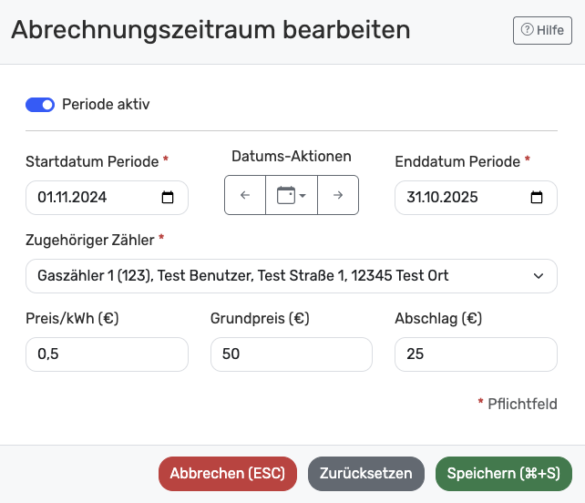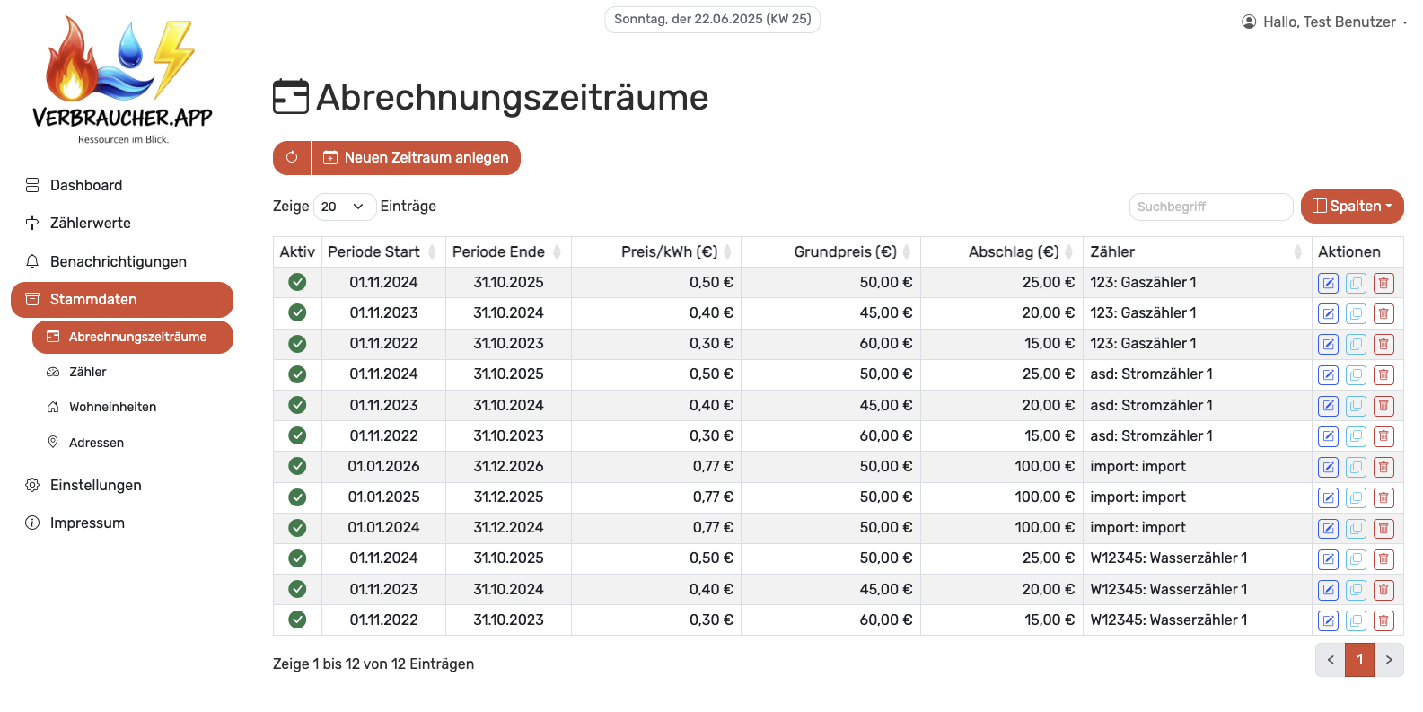 Hier könnt ihr für jeden eurer Zähler individuelle Abrechnungszeiträume flexibel anlegen und verwalten. Legt einfach Start- und Enddatum fest und hinterlegt die genauen Tarife wie Arbeitspreis, Grundpreis und Abschläge für jede einzelne Periode. So schafft ihr eine transparente Grundlage für eure Verbrauchsanalysen und behaltet eure Kosten immer im Griff.