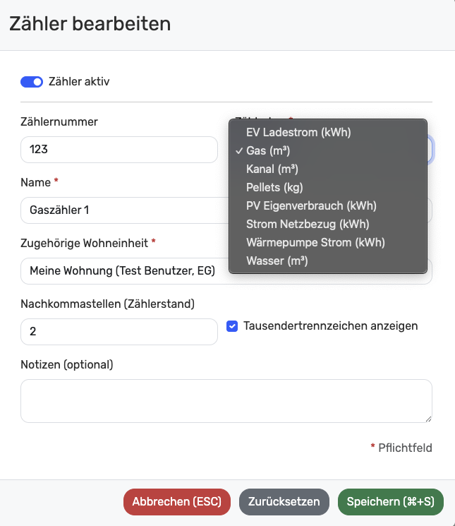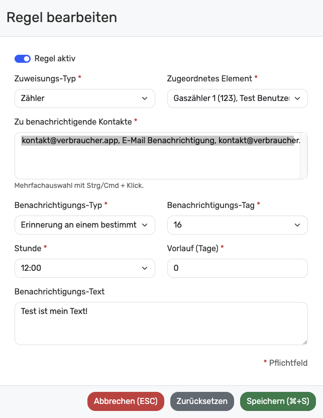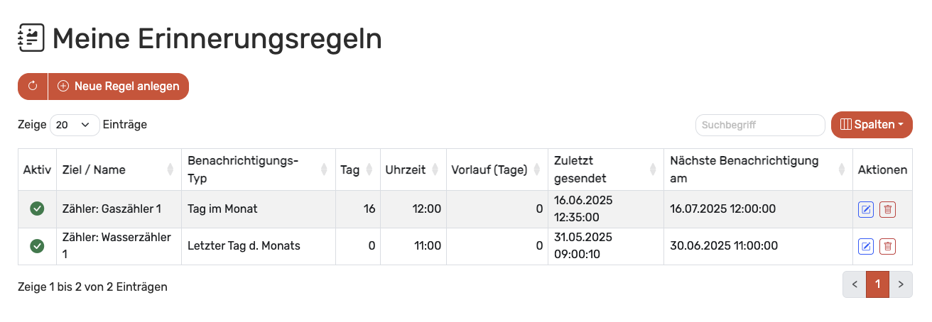 Hier könnt ihr eure individuellen Benachrichtigungen kinderleicht einrichten und verwalten. Legt für jeden Zähler eigene Regeln fest: Bestimmt den Benachrichtigungstyp (z.B. an einem bestimmten Tag oder zum Monatsende), den genauen Zeitpunkt sowie die Vorlauftage für eure Erinnerung. So bleibt ihr immer pünktlich und perfekt organisiert.