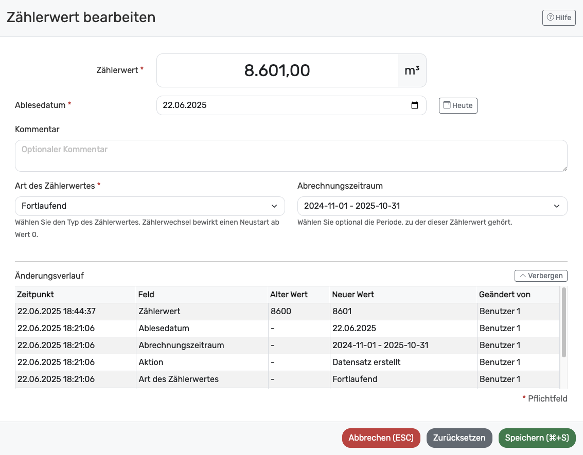 In der Ansicht 'Zählerwerte' könnt ihr eure Verbrauchsdaten präzise analysieren. Verfolgt die Entwicklung von Verbrauch und Kosten über verschiedene Abrechnungszeiträume hinweg in anschaulichen Diagrammen. Die detaillierte Tabellenansicht listet jeden einzelnen Messwert, die daraus resultierenden Kosten und Vergleiche zum Vorjahr auf – inklusive Filter- und Download-Möglichkeiten für eure vollständige Kontrolle.
